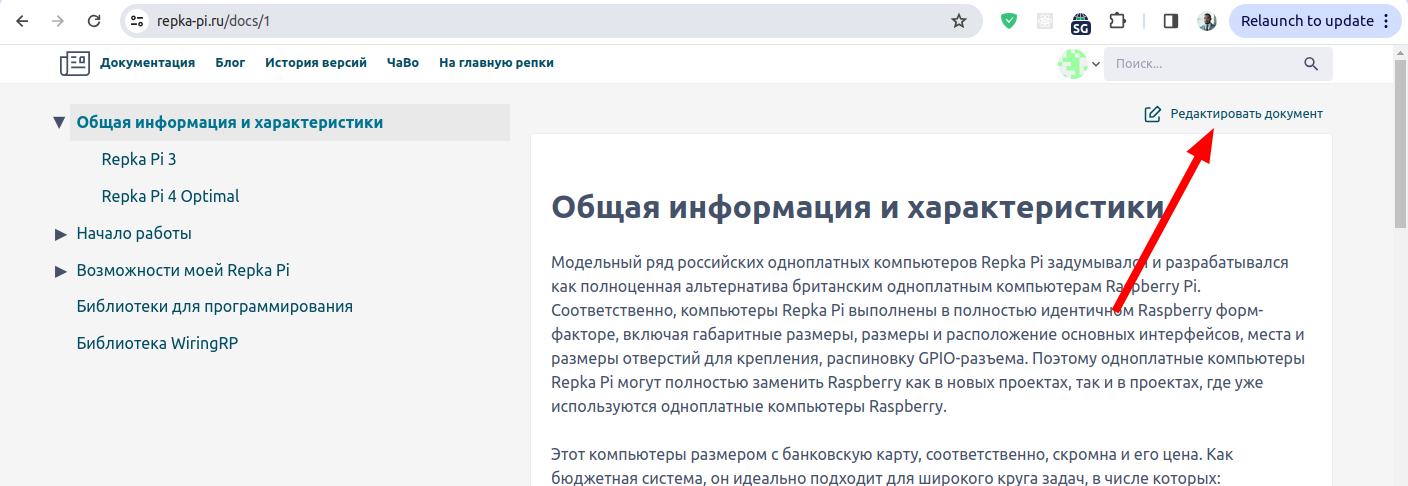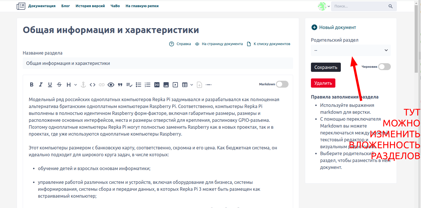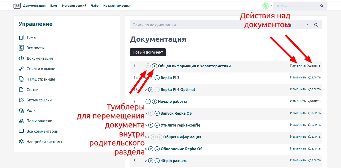 Изменение порядка сортировки разделов и переход к редактированию конкретного документа