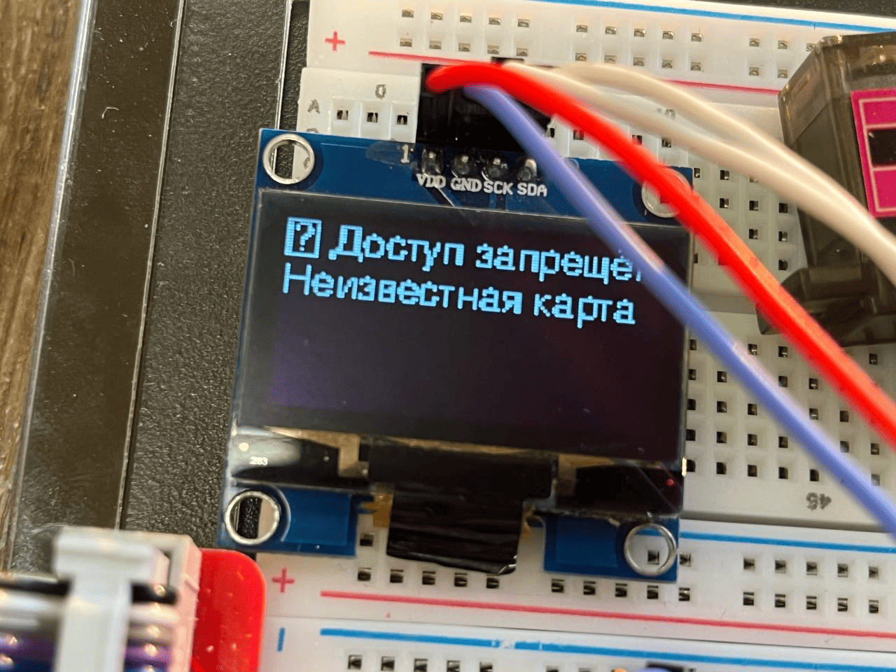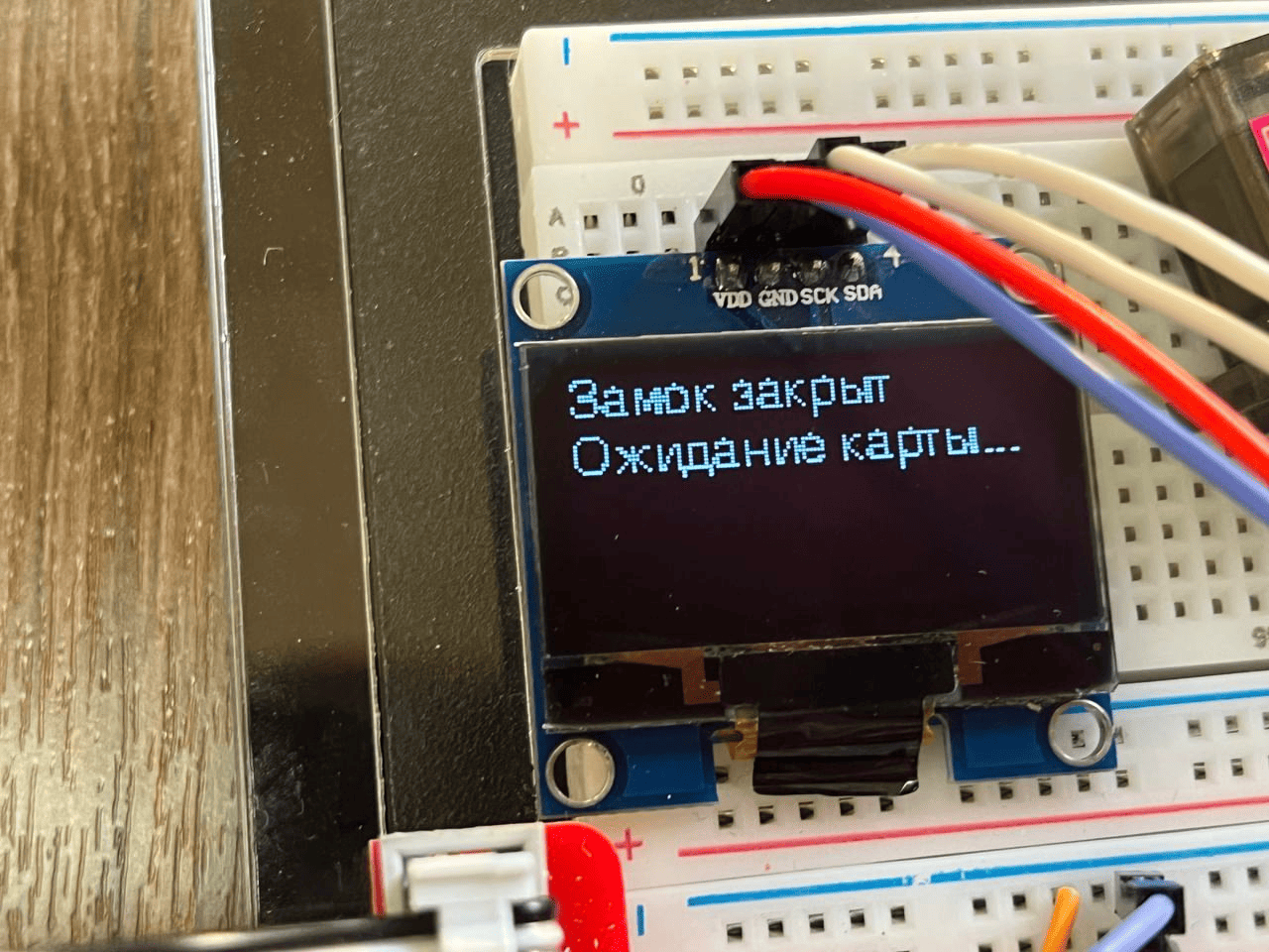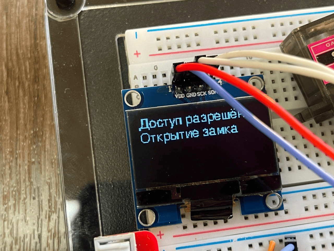 3. Дисплей OLED 0.96" I2C используется для отображения информации о состоянии системы безопасности.