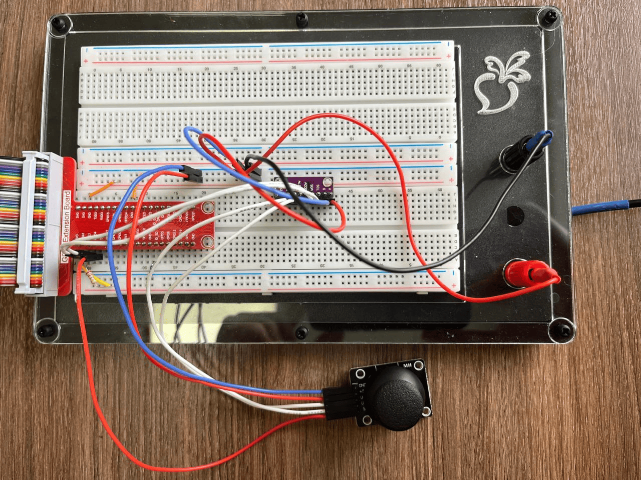 Как видно из рисунков 4 и 5, двухосевой джойстик подключается к аналоговым входам A0 и A1 внешнего АЦП, что позволяет считывать его положение по осям X и Y. Питание модуля осуществляется от линии 5V, обеспечивая стабильную работу устройства. Кроме того, джойстик оснащён функцией нажатия, которая реализуется через цифровой вход GPIO4. Для корректной работы этой функции необходимо подключение подтягивающего резистора номиналом 4.7 кОм к линии 3.3V, обеспечивающего надежное определение состояния кнопки при замыкании.
