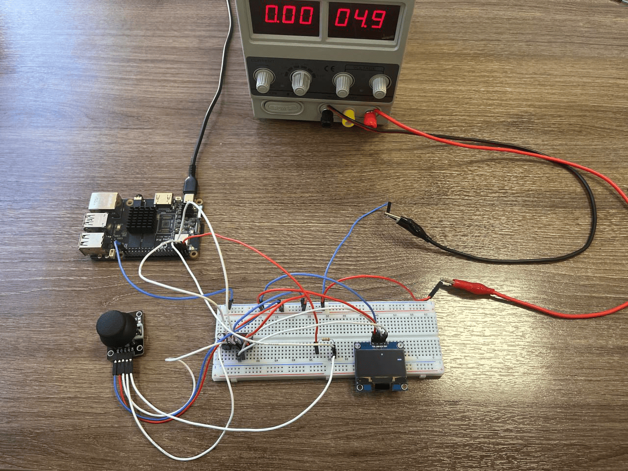 Во втором варианте проект адаптирован для автономной работы: графика выводится на компактный OLED-дисплей размером 0.96 дюйма, подключенным по интерфейсу I2C. Игра запускается на Repka PI 4, а управление также осуществляется с помощью джойстика. Вся информация о ходе игры отображается в реальном времени на OLED-экране, что делает этот вариант особенно интересным для портативных устройств и встроенных решений.