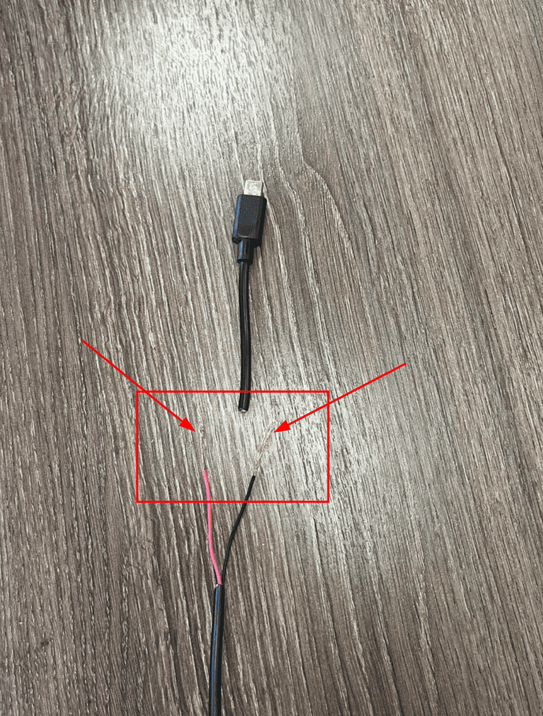 1.1. Если у вас нет набора УМК Repka, питание можно организовать с помощью подручных средств — любого провода и телефонного блока питания на 5V. Для этого разрежем провод и аккуратно зачистим его жилы: