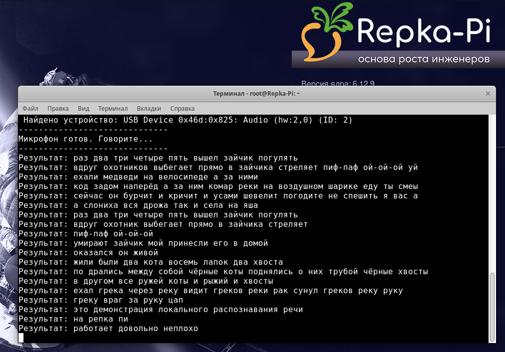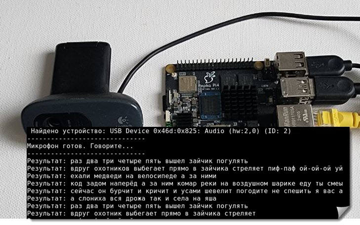 Рис. 7. Распознавание речи с микрофона на Repka-Pi 4.